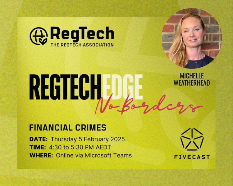 On 5 February, Michelle Weatherhead from Fivecast will be presenting at #RegTechEdgeNoBorders | Financial Crimes, hosted by The RegTech Association alongside leading RegTech providers from across the ecosystem.